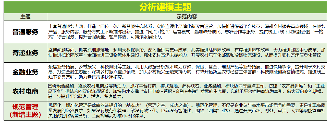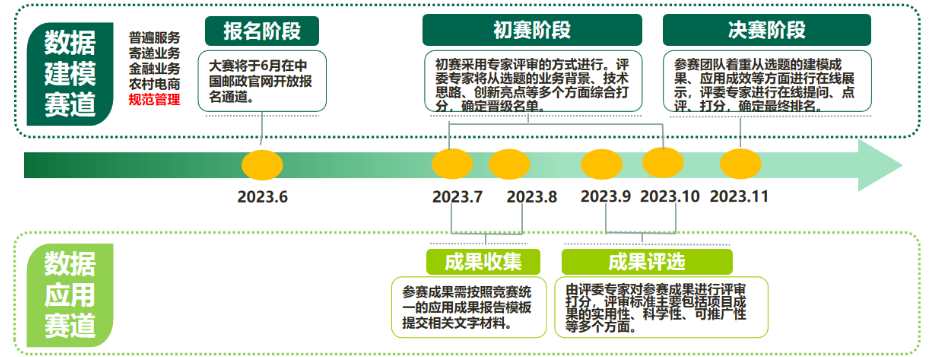 参赛团队可围绕大赛指定的“普遍服务、寄递业务、金融业务、农村电商、规范管理”五大主题,结合业务实际需求,开展分析建模及拓展,并通过ppt、线上答辩方式介绍方案思路及建模流程。