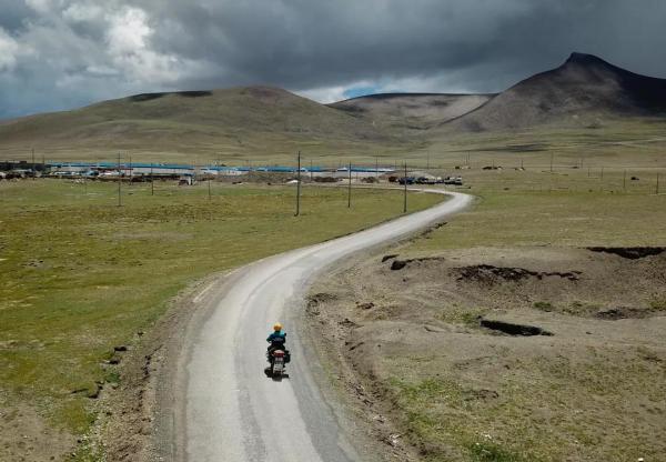 格桑次仁骑摩托车投递邮件,经过长途跋涉后海拔5500米的沙空村出现在前方(7月27日摄)