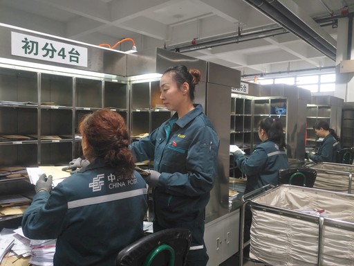 哈尔滨邮区中心局函件车间班组长岳伟(左二)正在对平信分拣台席进行质量检查。