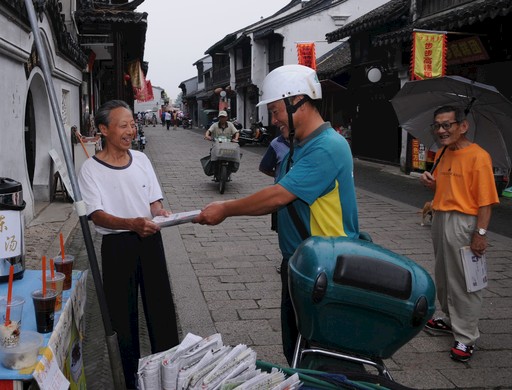 王晓丰在沙溪古镇投递报刊。