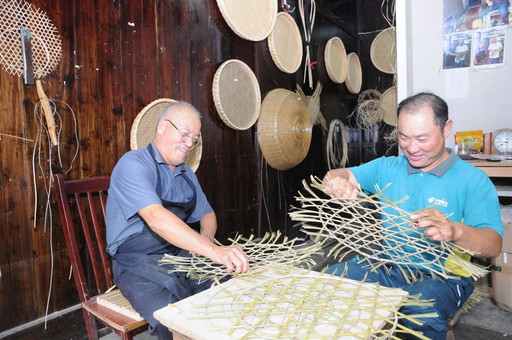 进入“非遗”文化馆,王晓丰的话明显多了起来:“父亲的店以前在镇东头,搬到这儿也是近两年的事儿。你们看这些大大小小的竹编制品,有果品盘、饭罩、鱼篓等。我祖上就是做竹编的,父亲从小就耳濡目染学习竹编。竹编从选竹、锯竹、破竹到编织、刷磨,再到竹编成品,一套流程下来10多个步骤都是他亲自完成,一个成品少则需要三五天,多则要几个星期甚至一个月。”王晓丰搬了张小凳坐在父亲身旁,“我平时工作忙,难得有空过来。”