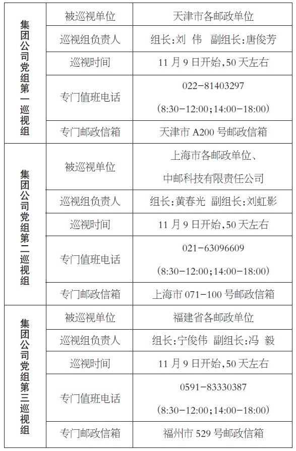 根据安排,党组首批巡视的3个巡视组将开展为期50天左右的巡视,时间从目前到12月底。通过发布巡视公告,设专门值班电话、专门邮政信箱等,受理反映被巡视单位领导班子及其成员、下一级党组织领导班子主要负责人和重要岗位领导干部问题的来信来电来访,重点是关于违反政治纪律、组织纪律、廉洁纪律、群众纪律、工作纪律和生活纪律等方面的举报和反映。同时,集团公司监察局(邮编:100808)也将在巡视期间受理反映上述问题的来信。□邮纪监