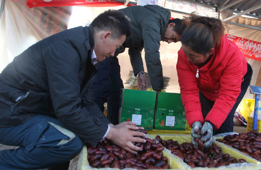 杨桂芳是灵武市一位土生土长的枣农。记者见到她时,她正在灵武长枣一条街的摊位上。一件玫瑰红色的羽绒服和一条淡蓝色的围巾把她包裹得严严实实。戴着手套的双手一捧一捧地把枣子轻轻放在箱子里。杨桂芳一边给客户装枣一边说:“这长枣好吃是好吃,就是很娇气,不能磕着碰着,一不小心有了裂口,枣就特别容易坏,就不好吃了。”轻捧快放,红红的长枣跟着杨桂芳的双手,有节奏地“跑”到了箱子里。杨桂芳帮客户把枣子搬到车上,又回到摊位,继续打理红红的枣子。