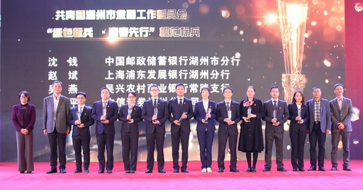 在浙江省湖州市金融系统近日举办的“建功新时代 金融青年说”演讲比赛上,共青团湖州市委对湖州市“绿色金融青年先行”十大模范标兵进行了表彰,邮储银行湖州市分行的沈钱(左六)获得此项荣誉。
