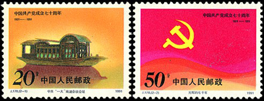 1921年7月召开的中国共产党第一次全国代表大会正式宣告了中国共产党的诞生,第一枚邮票展现了会址之一——浙江嘉兴南湖红船。该套邮票由雷汉林设计,于1991年7月1日发行。