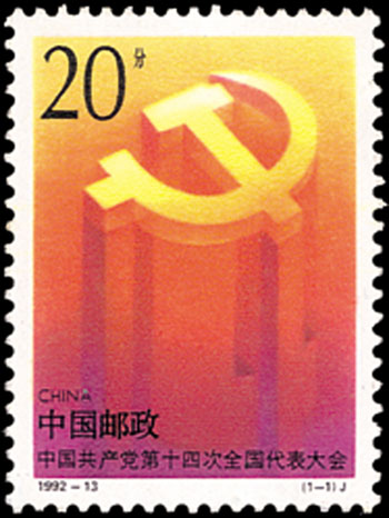 中国共产党第十四次全国代表大会于1992年10月12日至18日在北京举行。参加这次大会的正式代表1989人(出席开幕式1965人),特邀(1927年以前入党,并在党内担任过重要领导职务,德高望重的老党员)代表46人(出席开幕式35人),代表全国5100万党员。该套邮票由雷汉林设计,于1992年10月12日发行。