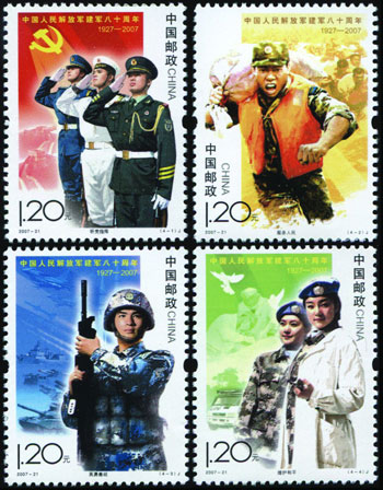 2007年8月1日发行《中国人民解放军建军八十周年》纪念邮票一套4枚,生动表现了中国人民解放军在党的领导下,参加抗洪抢险、进行军事训练以及参与联合国维和行动的英姿,集中反映了军队建设的发展成就、优良传统和我军忠实履行历史使命的时代风采。该套邮票由李翔、张树军、张卫奇、刘伟设计。
