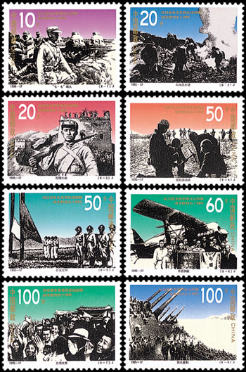 1995年9月3日,中国邮政发行了《抗日战争暨世界反法西斯战争胜利五十周年》纪念邮票,一套8枚。该套邮票的设计比较有特色,将8幅照片经过处理,形成类似于版画的效果跃然纸上,背景采用了不同的颜色。这8枚邮票反映了抗日战争中的八大事件,包括:七七事变、台儿庄大捷、百团大战、敌后游击队、芒友会师、华侨捐献、台湾光复、伟大胜利。该套邮票由何洁、陈楠、冯小红设计。
