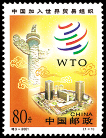 中国加入世界贸易组织协议于2001年11月在卡塔尔首都多哈正式签署。中国为23个创始缔约国之一。该套邮票由卢天骄设计,2001年12月11日发行。