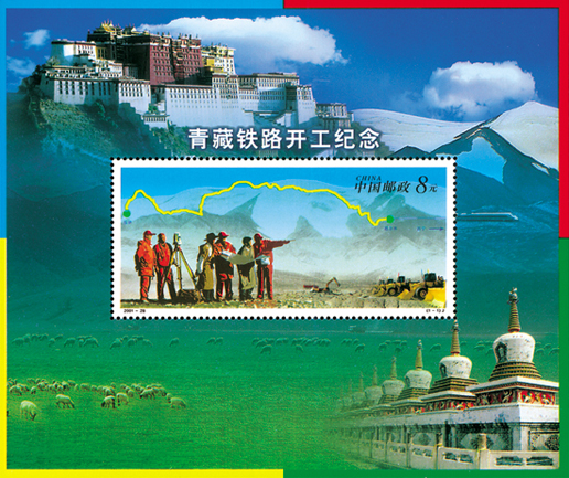 2001年12月29日,为纪念青藏铁路(格尔木至拉萨)开工,中国邮政发行了《青藏铁路开工纪念》纪念邮票小型张1枚。小型张主图为汉藏技术人员在勘察地形和青藏铁路示意图;边饰左上方为西藏布达拉宫,右上方是火车行驶在唐古拉山,左下方和中间为草原的羊群,右下方是青海塔尔寺;四角边框分别为蓝、红、黄、绿色。该小型张由阎炳武、杨文清设计。