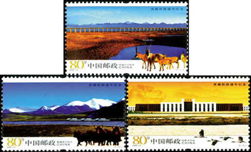 2006年7月1日,为纪念青藏铁路全线建成通车,中国邮政发行了《青藏铁路通车纪念》纪念邮票1套3枚。第一枚为“穿越可可西里”,画面主图展现了青藏铁路穿越可可西里自然保护区中水平如镜的碧池、广袤无垠的草原和远处平铺高原湖泊时的壮观景象。画面右下角为一群藏羚在闲庭信步。第二枚为“翻越唐古拉山”,画面主图展现了在连绵的雪山映衬下,三个巨大的火车头牵拉着长长的列车犹如一条钢铁巨龙翻越唐古拉山时的景象。画面右下角为一群野牦牛在奔跑企望。第三枚为“拉萨火车站”。画面主图展现了在雄伟的布达拉宫映衬下的拉萨火车站主站房。画面右下角为一行黑颈鹤在轻轻掠过。该套邮票由方军设计。