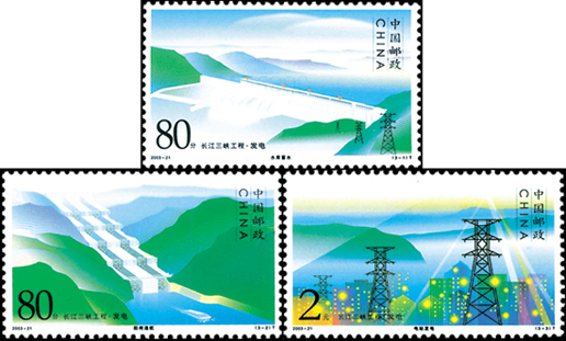 长江三峡地处三角地带,地势险峻,水流湍急。2003年,我国为了经济发展的需要,决定开启长江三峡工程,利用水能进行发电,这套特种邮票便架构了水库蓄水 、船闸通航、 电站发电这3个过程,表达了对三峡发电的美好愿景。该套邮票由陈楠设计,2003年8月20日发行。