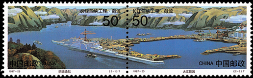 1997年11月8日,为纪念长江三峡工程大江截流成功,邮电部发行了《长江三峡工程·截流》特种邮票1套2枚。第一枚为“明渠通航”,图案为位于长江三峡工程中堡岛右侧的导流明渠,该渠既是二期施工期唯一的泄水河道,也是该时期中枯水季的重要航运通道。第二枚为“大江截流”,图案为位于长江三峡工程中堡岛左侧的大江截流主体。该套邮票以连票形式展示了明渠通航和大江截流的壮观场景,由徐勇民、王涌、刘寿祥、宋克静设计。