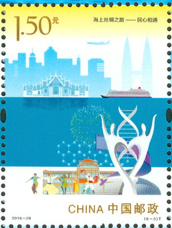 2016年9月10日,中国邮政发行《海上丝绸之路》特种邮票一套6枚,小全张1枚,邮票内容分别为:政策沟通、设施联通、贸易畅通、资金融通、民心相通、海上交通。该套邮票采用六枚联票形式设计,以画面中部的海平面进行串联,将画面分割为前景主题与背景。小全张边饰以海洋为背景。晨光初现,灯塔指引的灯光尚未熄灭,一轮红日由海平面冉冉升起,喻示着21世纪海上丝绸之路的崭新开始与光明前景。该套邮票由何洁、周岳设计。