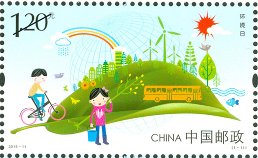 2015年6月5日是新修订的《中华人民共和国环境保护法》实施后的首个“环境日”。中国邮政发行《环境日》纪念邮票1套1枚,邮票采用卡通漫画的形式,描绘了一幅绿色生态、环保宜居的生活环境,以邮票为媒介倡导社会可持续发展的生活方式,鼓励和支持新能源的开发利用,传递积极向上、健康的生活态度。该套邮票由李志宏设计。