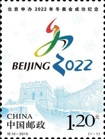 2015年7月31日,北京成功获得2022年第24届冬奥会举办权,举国上下一片沸腾。为纪念北京这次申办冬奥会成功,中国邮政于31日晚上特别发行一枚《北京申办2022年冬奥会成功纪念》邮票。邮票设计突出表现了北京申办2022年冬奥会的标志,同时辅以白雪覆盖的长城为衬托,带给人们冬季白雪茫茫的视觉感受。该套邮票由夏竞秋设计。