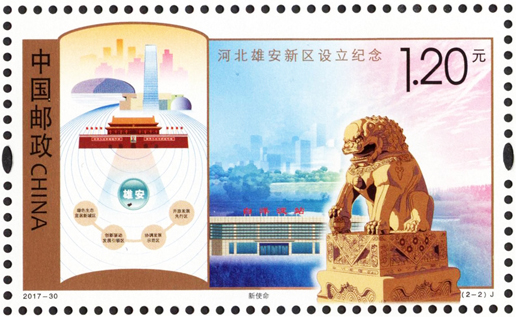 2017年12月22日,中国邮政发行《河北雄安新区设立纪念》纪念邮票1套2枚。图案内容分别为:新起点、新使命。该套邮票犹如徐徐展开的画卷,昭示着在以习近平同志为核心的党中央坚强领导下,雄安新区发展的美好前景。该套邮票设计者为武世宁。