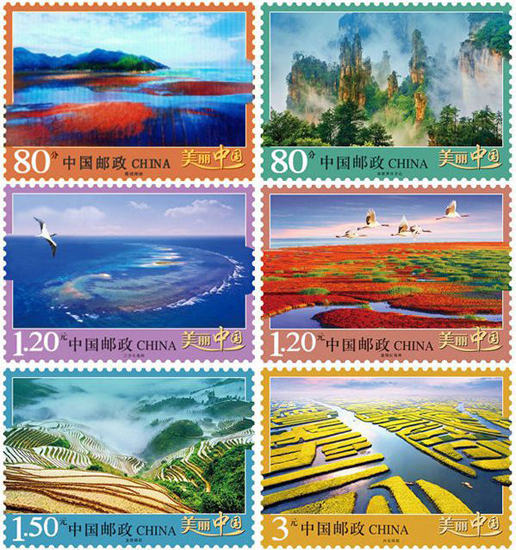 中国邮政于2013年5月19日发行《美丽中国》普通邮票第一组,一套6枚,邮票展现了我国六处风情各异的美丽景观:霞浦滩涂、张家界天子山、三沙七连屿、盘锦红海滩、龙胜梯田、兴化垛田。该套邮票由马立航、姜伟杰设计。