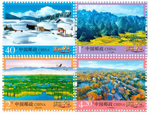 中国邮政于2016年5月12日发行《美丽中国》(二)普通邮票一套4枚,图案内容分别为: 牡丹江雪乡、兴义万峰林、石嘴山沙湖、杭州西溪湿地。《美丽中国》普通邮票第二组延续了第一组的设计风格,选取我国东南西北各地风光,其地貌差别大,风景多样,方寸之上展示了我国的幅员辽阔,山川秀美。该套邮票由马立航设计。