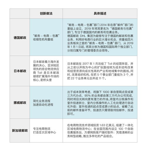在国外,面对“数字化”带来的冲击,许多国家邮政企业选择业务重组,以此来提高成本效率,部分邮政企业甚至剥离非核心业务,以此释放资金压力,着眼未来投资(见图表1)。
