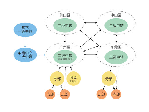 顺丰、通达系基本是网状网,在省内有多个分拨中心,分拨中心之间点对点直达,且在处理中心主要采用“散件+集包”的方式,邮件集中到达、集中交换,在处理中心时间更短;而邮政主要是采取点对集散的方式,所有邮件在一个中心交换,导致部分地市互寄的邮件衔接时间较短或不能赶发有效频次,需在处理中心停留到下一个频次才能发运,导致邮件在处理中心时间过长。“因此,为了进一步缩短时限,邮政在网络布局时就应逐步将单点集散网升级到多中心网状网,充分发挥中山、东莞、深圳等节点功能,形成区域网,各区域、各中心直接够量直达;同时,打破行政区域,以时限、效益优先为原则,灵活组网。”赵洪涛告诉记者。