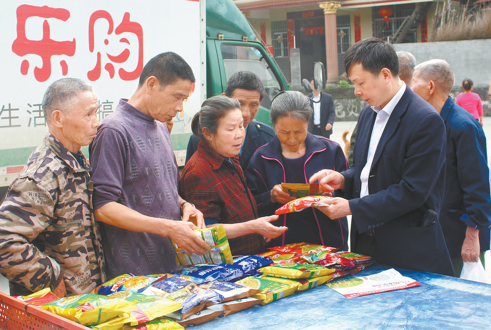 春耕忙,送科技下乡忙。召开村级产说会、“服务三农”主题订货会,联合农资厂家为农民开展无人机喷洒农药等,湖南省邮政分公司送科技下乡活动正在全省火热开展中。至目前,全省邮政农药销售预计将超过3万桶,通过产说会预订复合肥已超过4000吨,其中,高效肥占比超过80%。图为4月4日,会同县邮政分公司工作人员在金子岩乡白市村为村民介绍农资。 □杨芳东 摄影报道