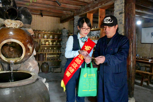 邮政员工到陶瓷小镇走访宣传,向客户介绍邮政金融业务。