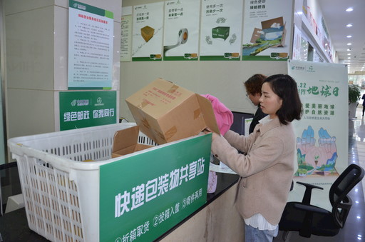 截至4月底,江苏省东台市邮政分公司日均回收快递包裹箱约85个。4月22日,在第50个世界地球日,东台市分公司因地制宜在32个邮政网点设置快递包装物共享站,启动快递包装物循环利用工作,旨在推动绿色邮政建设,切实践行绿色发展理念。图为在东亭路支局领取包裹的客户将包装箱投入共享站。 □单国胜 摄影报道