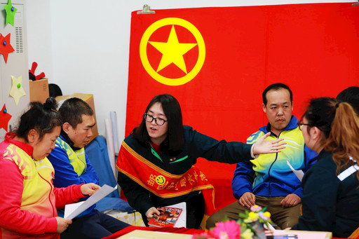 青年志愿者和残疾人朋友一起阅读《雷锋日记》,编排《年轻纯洁的心》。