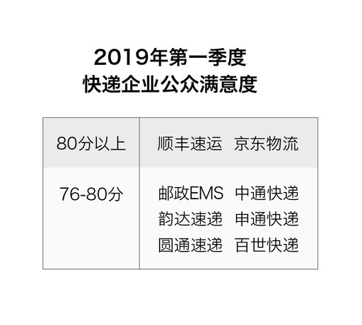 4月24日,国家邮政局发布了关于2019年第一季度快递服务满意度调查和时限准时率测试结果的通告,在快递企业公众满意度方面,得分在80分以上的企业为顺丰速运、京东物流,得分在76-80分之间的企业为邮政EMS、中通快递、韵达速递、申通快递、圆通速递和百世快递。(见图表3)在此之前,国家邮政局发布2018年快递服务用户满意度、时限准时率调查结果。快递企业总体满意度排名依次为:顺丰速运、邮政EMS、京东物流、中通快递、韵达速递、圆通速递、百世快递、申通快递、德邦快递、优速快递。在受理环节表现较好的企业有:顺丰速运、中通快递和韵达速递;在揽收环节表现较好的企业有:顺丰速运、中通快递、邮政EMS、百世快递;投递环节表现较好的企业有:顺丰速运、京东物流、中通快递、邮政EMS、韵达速递;售后环节表现较好的企业有:京东物流、顺丰速运、中通快递、邮政EMS和德邦快递。信息服务方面表现较好的企业有:京东物流、顺丰速运、中通快递、韵达速递。(见图表4)