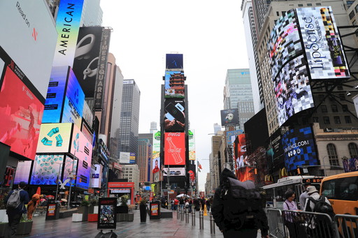 纽约时报广场循环播放世界邮展宣传片。新华社记者 张墨成 摄