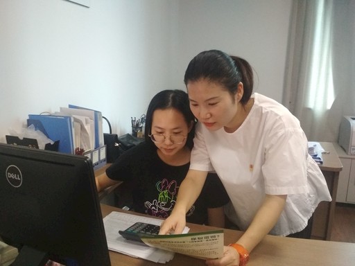 张静姣(右)与团队成员一起制定政府合作方案。