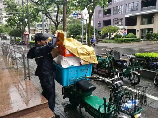 上海:台风天气,上海市1.1万名“邮政小哥”一如既往坚守投递一线,不负客户所托,确保百姓用邮。李璐瑶 摄
