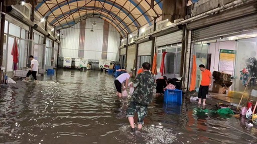 山东济南:济南市邮政寄递事业部历城区工业北路营业部受灾严重,员工及时转移邮件及物资。李小乐 摄