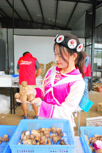 漂亮的纳西族女孩正在展示自家的松茸,她身后是正在忙着封箱的邮政员工。高兴槐  摄