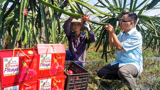 针对“919电商节”,浙江省瑞安市邮政分公司马屿营业部员工提前走访火龙果种植户,将火龙果引入邮政电商平台,帮助农户销售。邮政员工还协助农户进行火龙果采摘、装箱、称重、装车工作,为火龙果线上销售、线下寄递打通“绿色通道”。截至9月15日,瑞安市分公司已“销售+寄递”火龙果3000件。图为邮政员工在果园协助农户采摘火龙果。 □狄瑶 摄影报道