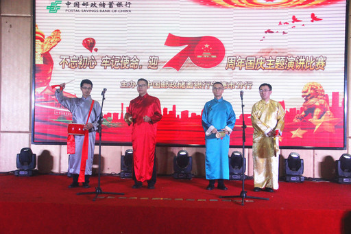 邮储银行福建省宁德市分行党委举办了“迎70周年国庆”主题演讲比赛。比赛采用双人演讲的形式,11支代表队的选手声情并茂地用小故事、小视角呈现对祖国的无限热爱。员工们表演了令人捧腹大笑的“三句半”,深情演唱了《红旗飘飘》《我和我的祖国》等爱国歌曲。阮玲玲 摄影报道