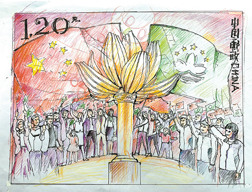 问及同为韩秉华设计的《澳门回归祖国二十周年》与两年前的《香港回归祖国二十周年》邮票有什么变化,他表示:“整体风格差不多,只是构图不一样,澳门回归的相对复杂一些,光是画面中的人物就多了不少,场面显得更为热闹。”