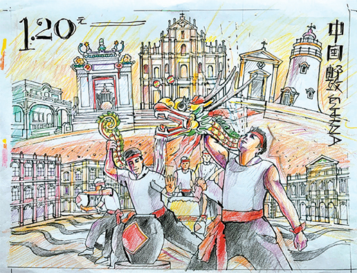 第2枚“中西荟萃 和谐共融”,议事厅前以分别手握龙头与龙尾的舞醉龙师傅为前景,舞醉龙团队姿态各异,相互呼应,展现澳门舞醉龙的特色。背景为人们熟悉的澳门标志性景观大三巴牌坊、妈阁庙、东望洋灯塔,还有葡韵住宅式博物馆。“通过中西建筑物的简化图形,反映澳门多元文化色彩和谐共融。在舞醉龙的红、黄、黑、白等传统色彩与葡式建筑的橘黄、玫红与白色调糅合下,营造出欢快愉悦的氛围。”韩秉华介绍。