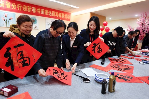1月9日,邮储银行湖南省分行直属支行内,书画家们正为客户书写“福”字和春联。当天,湖南省分行举办了迎新春书画家送福写春联活动。书画家张青渠、袁绍明、俞成林、张楚务、胡伟一行来到网点,现场泼墨挥毫,通过写春联、写“福”字的方式,送出2020年的新春祝福,共同迎接新春的到来。 □杨伊媛 摄影报道
