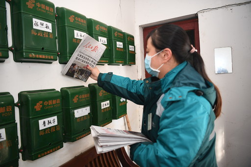 湖南省邮政分公司优化网运作业组织和生产流程,缩短投递内部作业时限,让投递员提早出班,全力以赴做好党报党刊投递工作,将党中央关于疫情防控工作的最新指示精神及时、准确传递到千家万户。湖南省分公司为投递网点配备了洗手液、消毒液、测温仪,每隔两小时对投递作业现场进行消毒,出班前、归班后对揽投车辆进行喷洒消毒;为投递人员配备了医用口罩,并在到岗和归班时进行体温检测,体温正常方可上岗。图为2月11日,长沙市分公司车站路揽投员杨望归在芙蓉区五里牌社区投递当日《人民日报》。 记者 刘园园 摄影报道