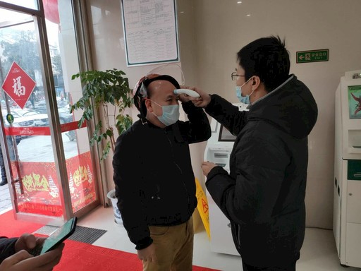 武穴市刊江路支行工作人员为客户测量体温。