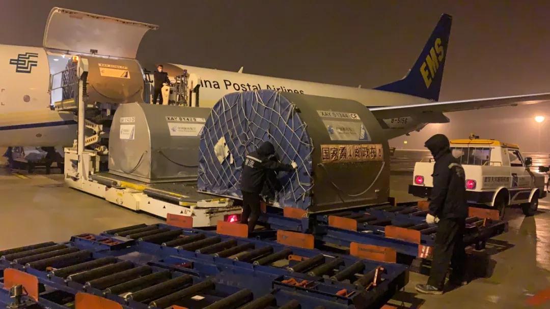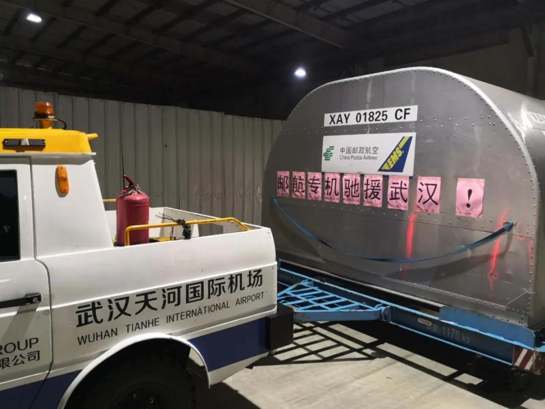 2月27日17时32分,中国邮政航空公司CF9121航班承载着总重1.618吨的16台德国产ECMO设备及配套耗材从北京首都机场起飞,于19时16分在小雨中飞抵武汉天河机场,邮航武汉办事处和天河机场地面保障部门第一时间展开卸机作业,完成这批救命设备的空陆交接。