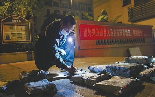 小区门口没有路灯,投递员汪军只能借着手电筒的微光,一一电话联系家长取教材。 李平 摄