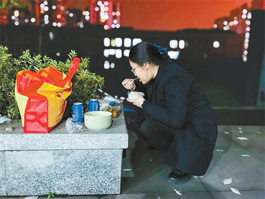 晚上9:00,学府第一小学封装现场,已经是辗转封装的第4 所学校,沙坪坝曾家支局宋倩在封装间隙将就吃点晚饭。向巍 摄