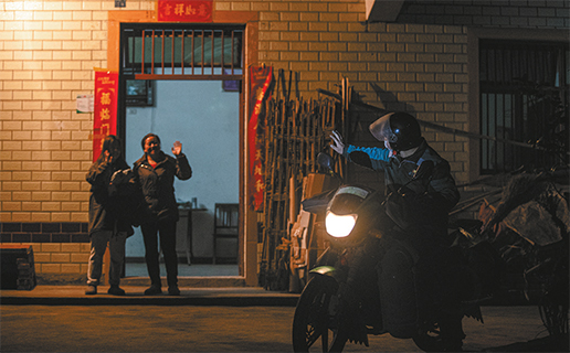 晚上10:30,家住重庆市巴南区木洞镇的张玉宁同学收到教材后,开心地与爸爸一道将投递员周继胜送出家门。朱亚坤 摄