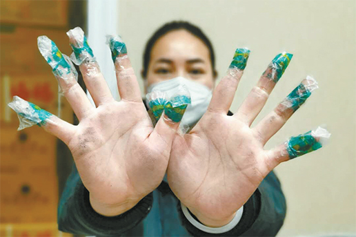 手被划破,来不及找医用胶布,万州移民广场邮政所负责人蒲春燕就用邮政胶带包上手指接着打包。谭海霞 摄
