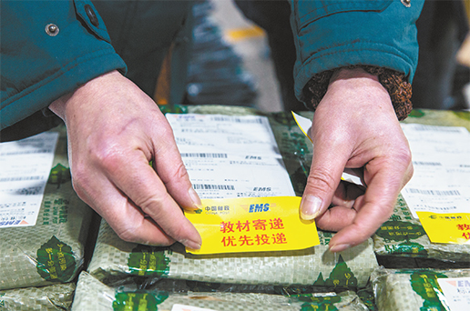 经过二次封装、防水处理之后,处理中心人员为教材贴上寄递专用标签。朱亚坤 摄