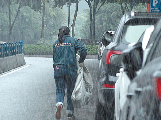 江北寄递事业部帮扶人员陈俊兰投递途中突遇大雨,她知道教材有防护,为节省时间,顾不上打伞一路猛跑。 朱亚坤 摄