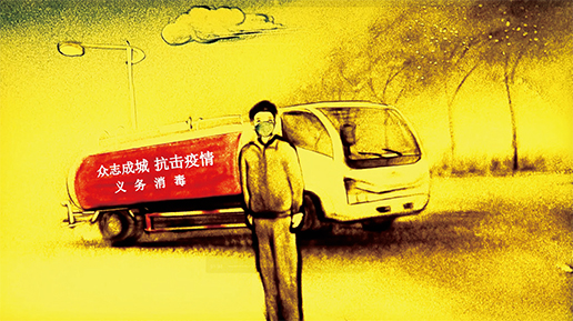 记者又问陈娜,知道他给消毒车队捐了20桶消毒液吗?陈娜摇摇头说,他不讲,但是我支持他。于是,她用自己的一技之长为他画了一幅沙画,名字就叫《消毒送安全 邮件送希望》。
